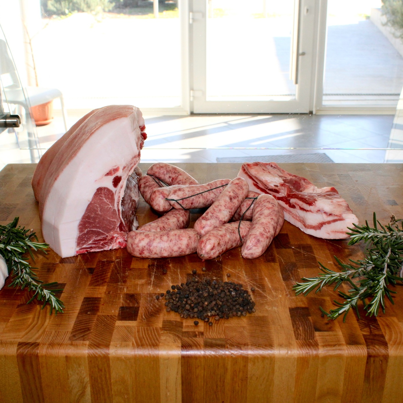 Carni fresche, cotti, stagionati e sott’olio: tutto viene prodotto in azienda e venduto direttamente, senza intermediazioni. Porchetta fragrante, prosciutti stagionati naturalmente, pancette, salami e salsicce preparati secondo le antiche ricette di famiglia — solo sale, pepe, aglio, finocchio e vino. Nessun conservante, colorante, additivo o antiossidante. E niente glutine! Solo prodotti di altissima qualità e dal sapore autentico, come una volta.